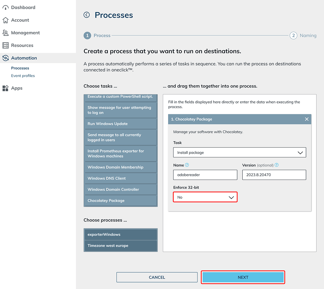 choco install adobereader). However, for input in oneclick, only the package name, in this exampleadobereader, should be entered, withoutchoco install.