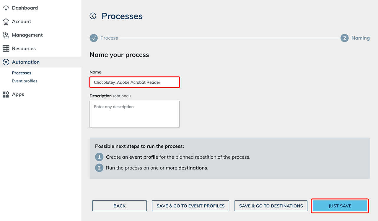 - Give the newly created process a name and add a description if needed.