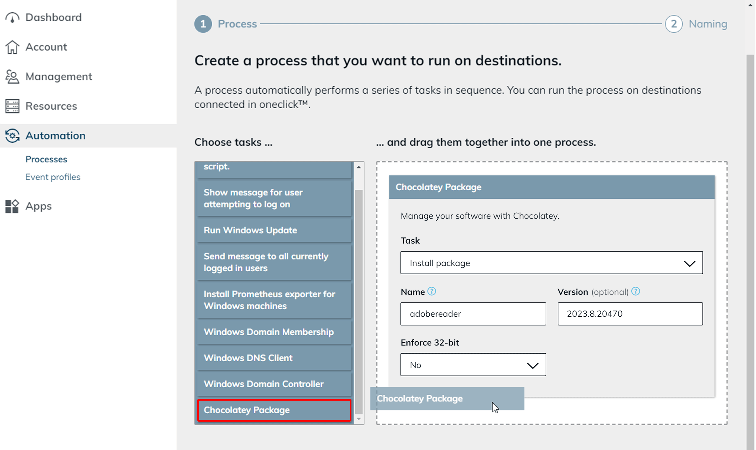 - Create a new process and drag the "Chocolatey Package" task into the right-hand area of the screen.