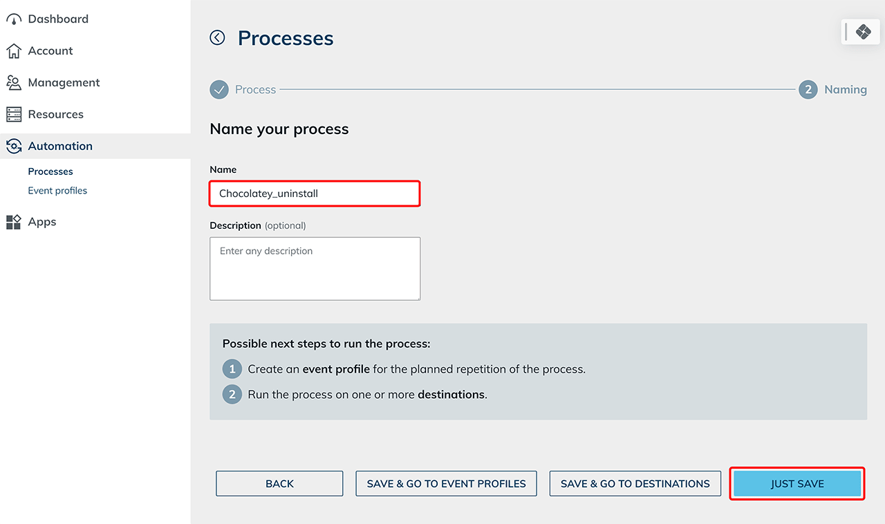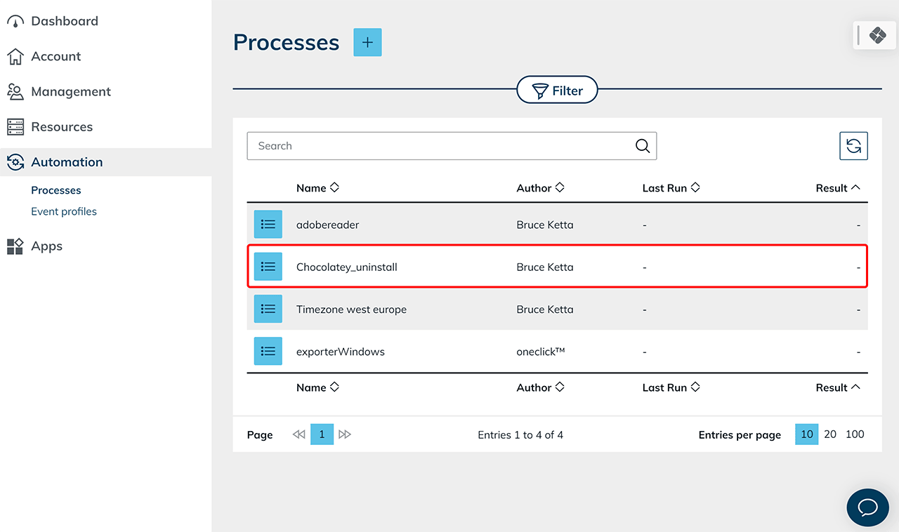 Then click on Processes in the Automation tab. Your template for removing software using Chocolatey is now displayed in the list of all created processes on the right-hand side.