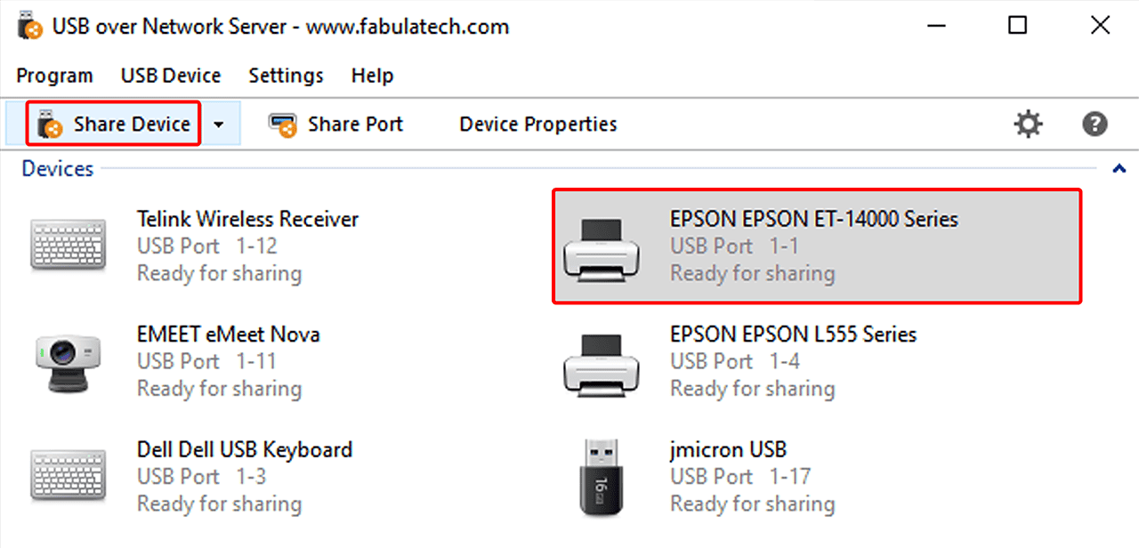 Now enable the USB device you want to use in the VDI in the server component on your end device. To do this, select the device and click Share Device in the menu bar at the top.