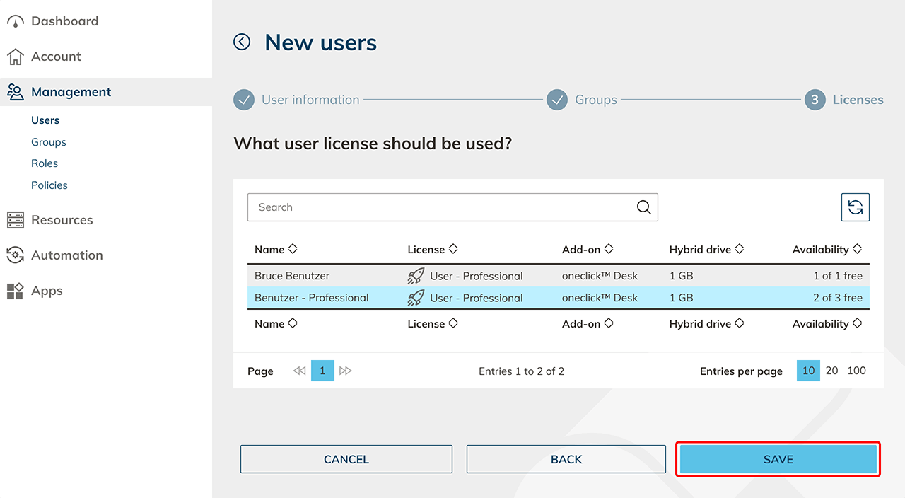- Select the "Demo License" if your users want to try oneclick™ for free for one week. Your users will receive some information on notifications about the demo's functionality when they log in.
