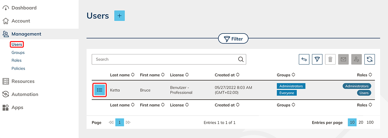 - Select the corresponding users by clicking on the rows. Selected user lines will be highlighted in blue. Now you can click on the Letter icon to send the oneclick™ registration link to the stored e-mail addresses of the selected users.
