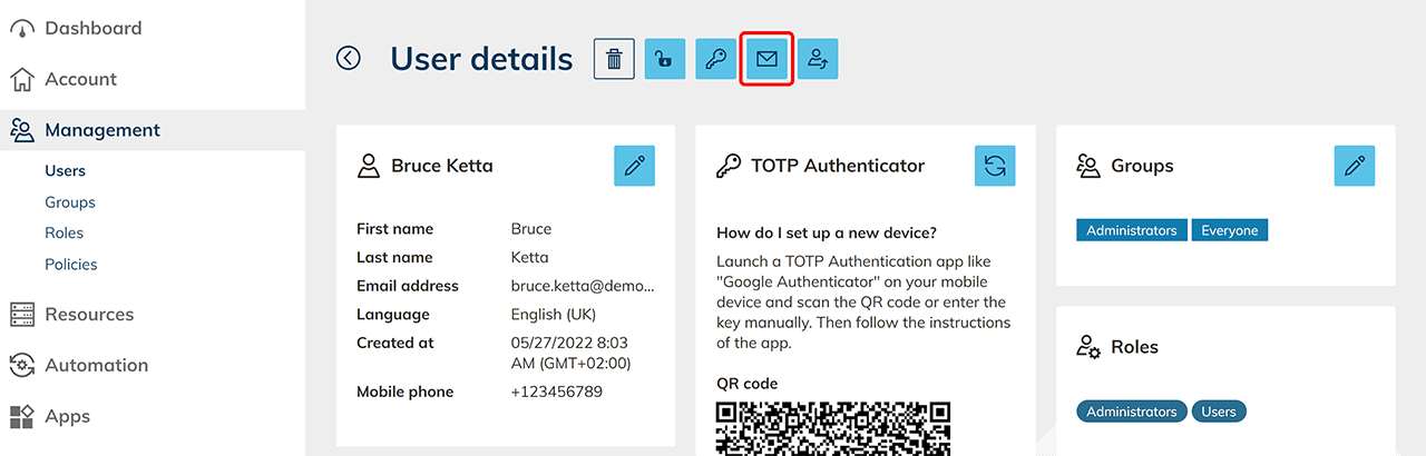 Click on the Envelope icon to send the oneclick™ registration link to the email address of the user.