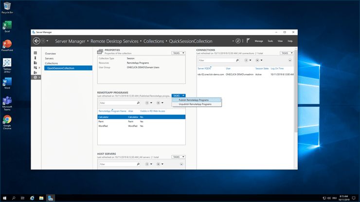 - On your server go to Server Manager / Remote Desktop Services / Collections / QuickSessionCollection.