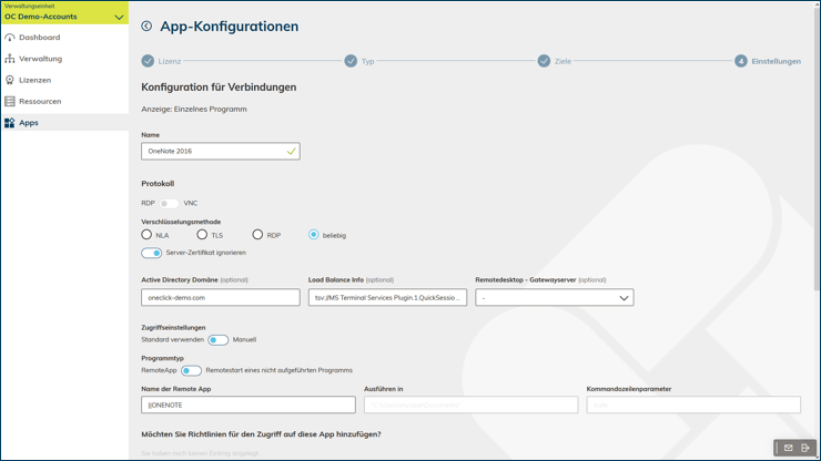 If you want to deploy a single program (remote app) in oneclick™ (and not a full Windows desktop), follow these steps: