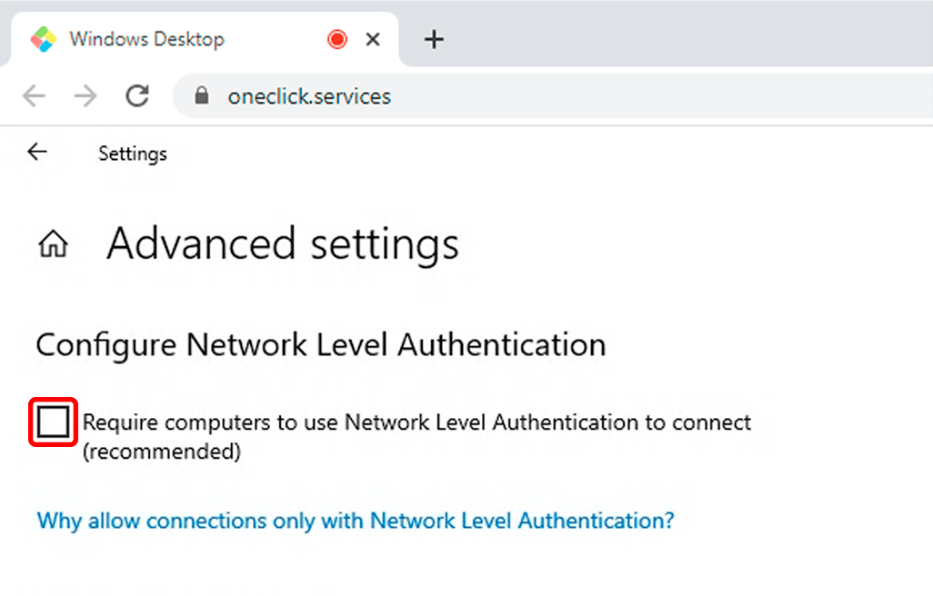 Disabling NLA may pose a security risk due to fake servers. However, oneclick™ ensures the authenticity of the accessed server using its streaming technology, effectively preventing “Man in the Middle” attacks while still maintaining a secure connection.