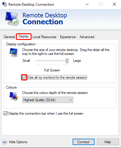 - Go to the “Display” tab and enable the option “Use all my monitors for the remote session”.