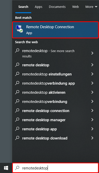 - Type “Remote Desktop Connection” into the taskbar search field and open the Remote Desktop Connection app.