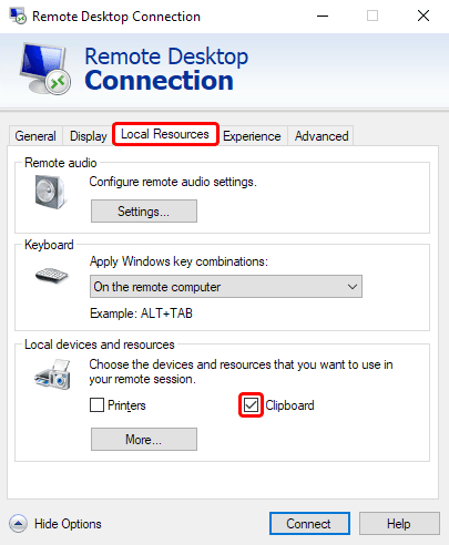 - Go to the “Local Resources” tab and enable the “Clipboard” option.