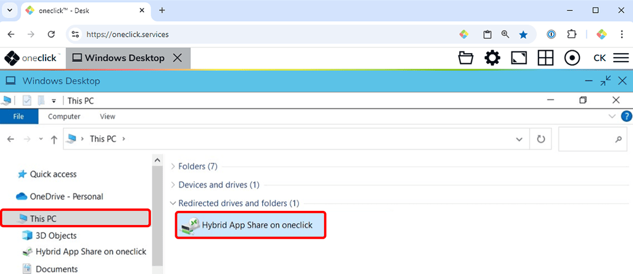 The drive/folder "Hybrid App Share on oneclick" is located in the Windows Explorer (e.g. on a Windows Remote Desktop) in the navigation area on the left under This PC.