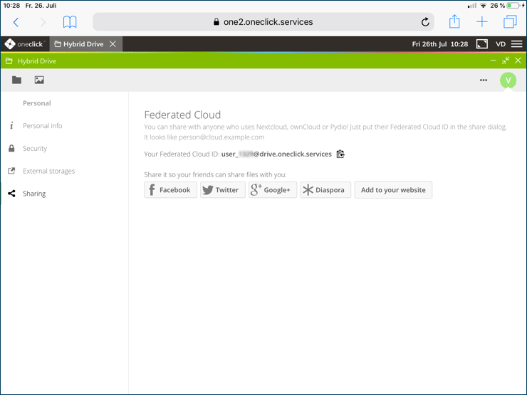 - Click on the Sharing submenu and copy the "Federated Cloud ID" here. This is your server address.