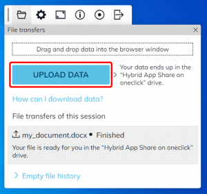- You can also click on Upload data to upload files from your local device. These will as well be displayed in the “Hybrid App Share on oneclick” afterwards.