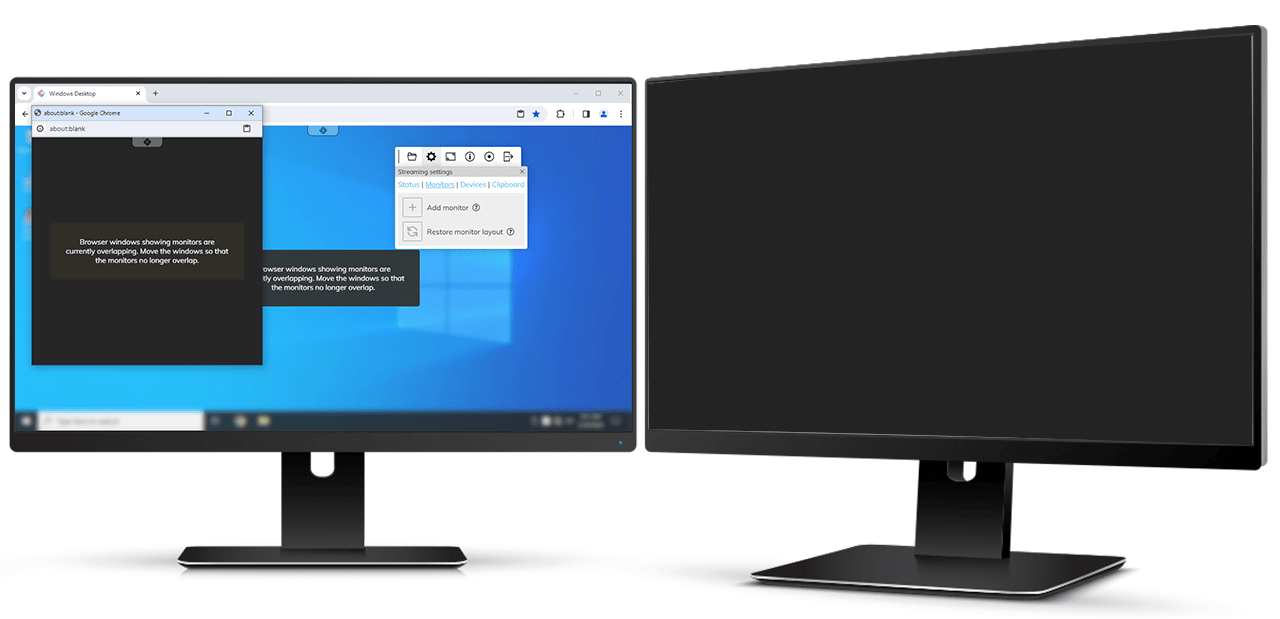 Drag and drop the open monitor window to the desired screen and adjust the size as well as the position to your requirements. If the monitors overlap or if they are not in the foreground, an error message will be displayed. You can only work with oneclick™ after positioning the monitors correctly. An error message will also be displayed if the browser zoom is activated or the sidebar is displayed.