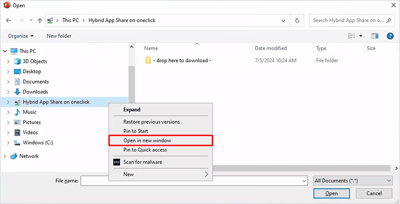This process may vary depending on the application; you may also need to click on Browse or a similar option. - In the left navigation menu, click on "Hybrid App Share on oneclick" and then right-click on Open in new window.