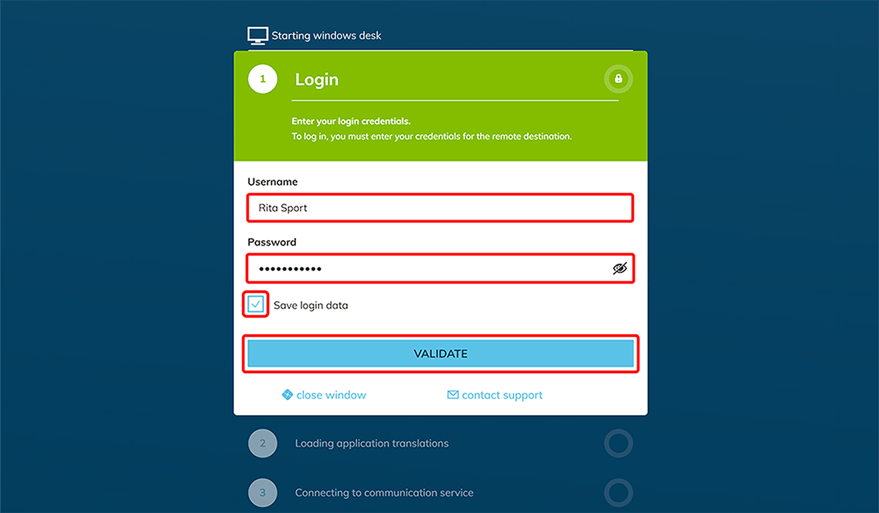 If your login data is not stored and you are entering your data again each time you log in, the following window will appear first under point 2. - Enter your Username and your new Windows Password. Optionally tick “Save login data” and click Validate.