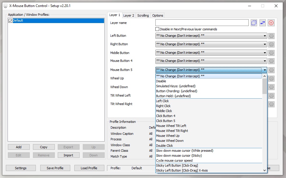 Assignment of individual mouse buttons using X-Mouse Button Control in Windows